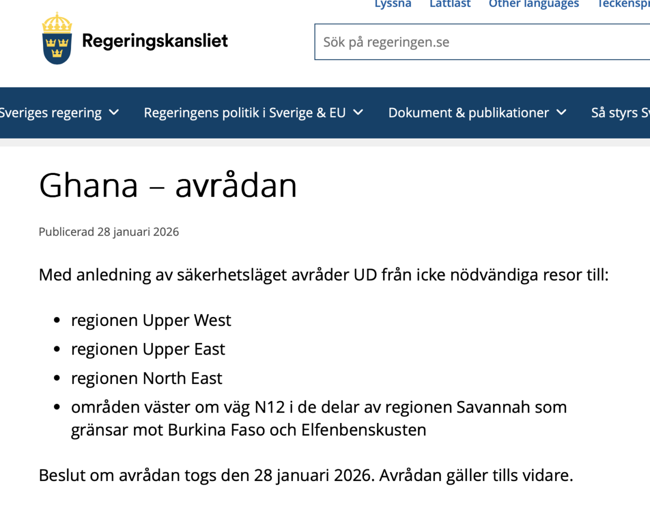 UD avreder från icke nödvändiga resor till flera regioner i Ghana med anledning av säkerhetsläget.  Beslutet...