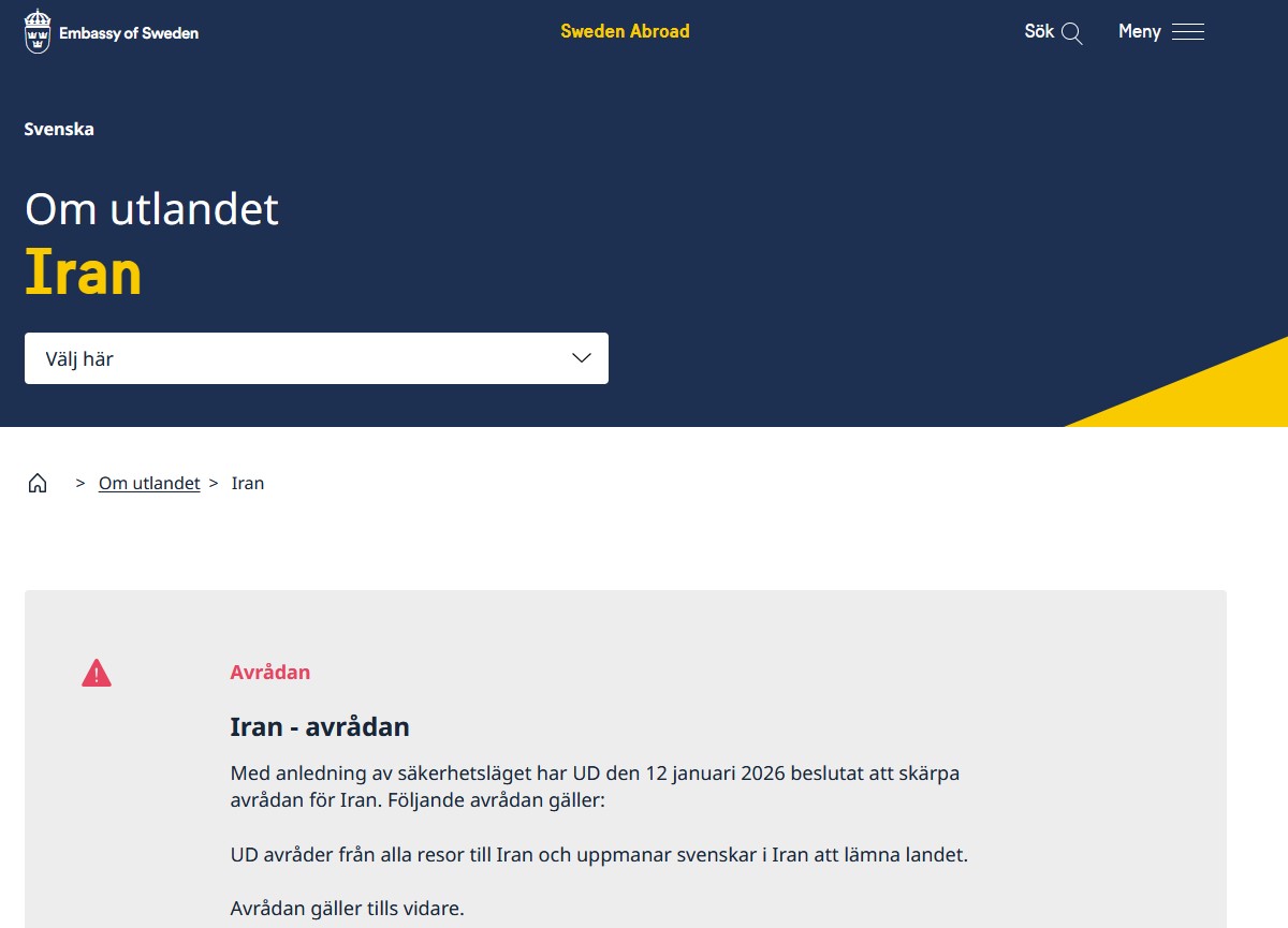 Utrikesdepartementet uppmanar alla svenskar att lämna Iran. ”Med anledning av säkerhetsläget har UD den 12 januari...