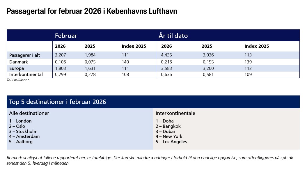 2,2 miljoner passagerare passerade genom Köpenhamns flygplats under årets kortaste månad. Två vinterhelger med många resenärer och ett generellt ökande antal transferpassagerare gjorde att det var den mest hektiska februari någonsin på flygplatsen. Oroligheterna i Mellanöstern skapar dock osäkerhet och har påverkat delar av flygtrafiken i slutet av månaden.