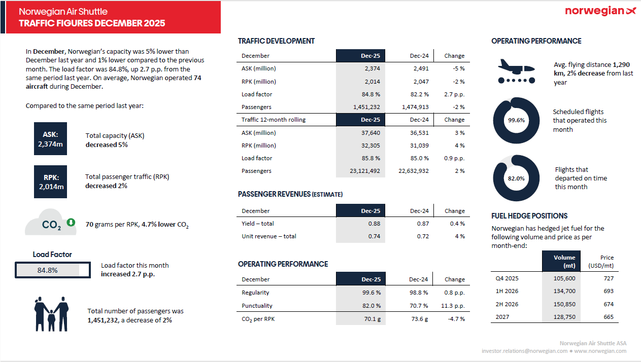 Norwegians kapacitet (ASK) var 2 374 miljoner säteskilometer i december, en minskning med 5 procent jämfört med december 2024. Faktisk passagerartrafik (RPK) var 2 014 miljoner säteskilometer, en minskning med 2 procent jämfört med samma period föregående år. Kabinfaktorn var på 84,8 procent, upp 2,7 procentenheter från december 2024. I december hade Norwegian 74 flygplan i drift i genomsnitt.