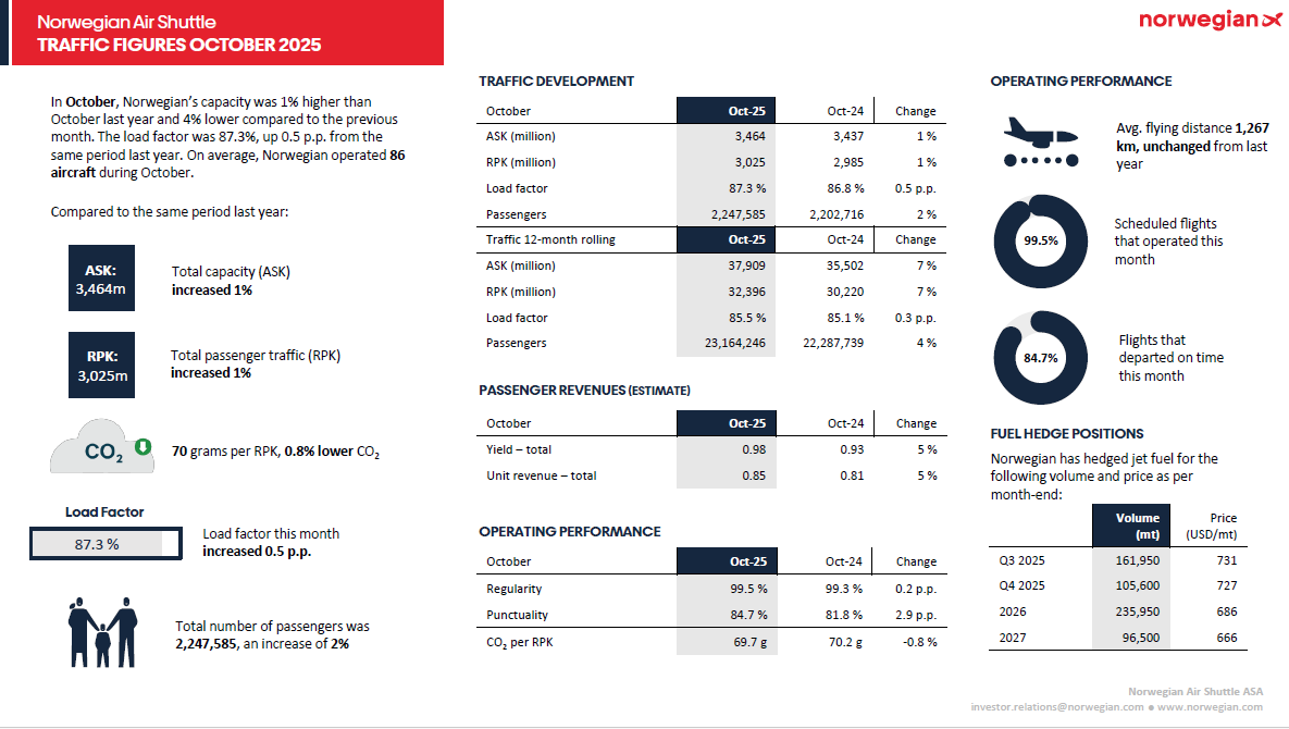 Norwegians kapacitet (ASK) i oktober var 3 464 miljoner säteskilometer, upp 1 procent från förra året. Faktisk passagerartrafik (RPK) var 3 025 miljoner säteskilometer, också upp 1 procent. Kabinfaktorn var 87,3 procent, upp 0,5 procentenheter. Norwegian hade i genomsnitt 86 flygplan i drift i oktober.
