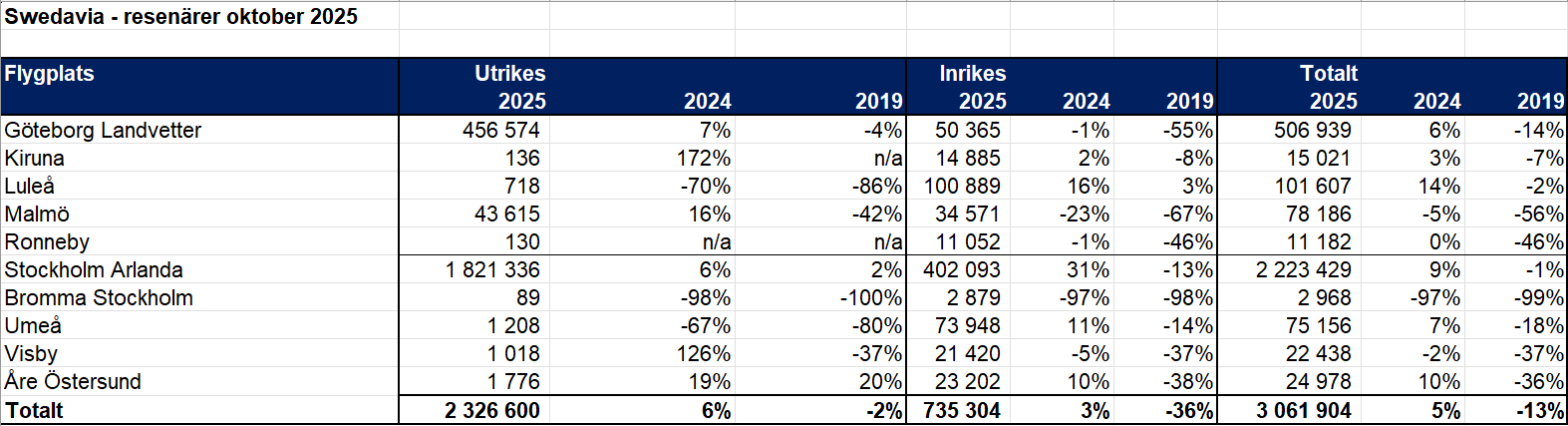 Under oktober reste drygt tre miljoner resenärer via Swedavias tio flygplatser, vilket är en ökning med fem procent jämfört med oktober 2024. Den starka trenden för utrikesresandet höll i sig, men även inrikesresandet ökade under månaden.
