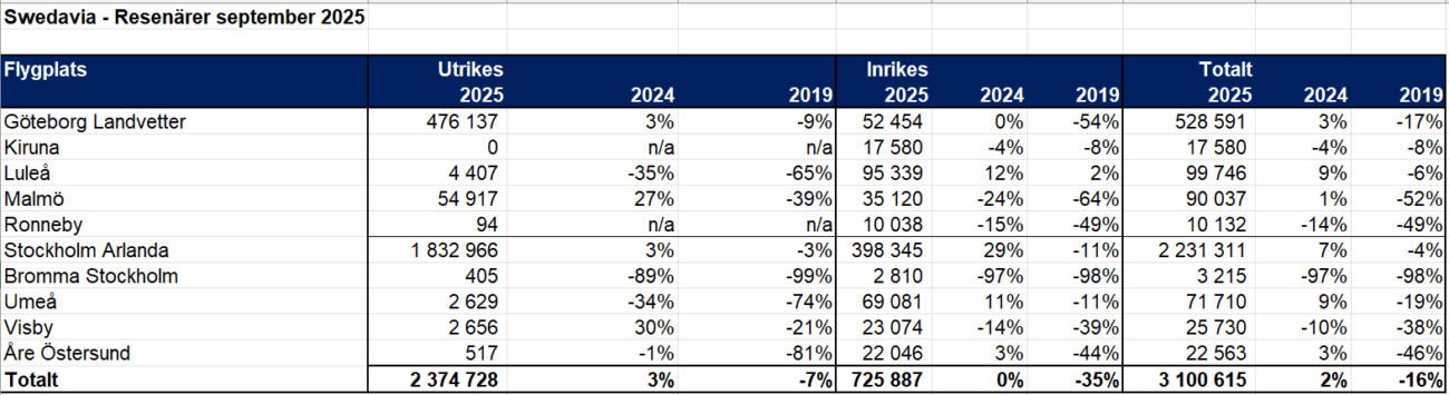 I september reste drygt 3,1 miljoner resenärer via Swedavias tio flygplatser. Det är en ökning med drygt två procent jämfört med september 2024. Utrikesresandet ökade med tre procent medan inrikesresandet ligger på samma nivåer som förra året.